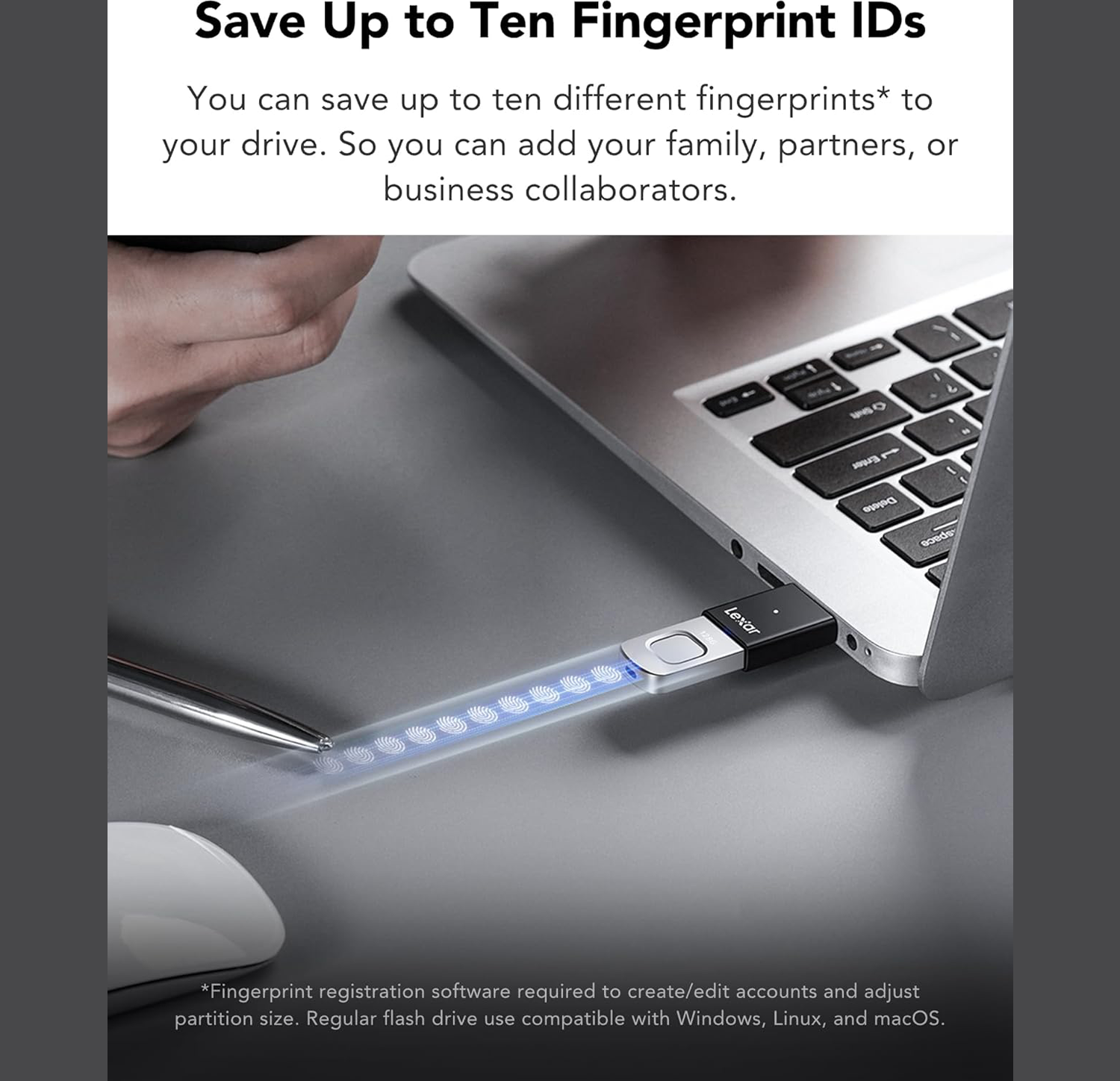 The Lexar JumpDrive Fingerprint F35 PRO USB 3.2 Gen 1 Flash Drive offers secure and high-speed data storage with fingerprint authentication, eliminating the need for passwords. It supports up to ten unique fingerprint IDs and provides ultra-fast recognition in less than one second. With read speeds up to 400MB/s and write speeds up to 350MB/s, it enables rapid file transfers. The drive also features 256-bit AES encryption for enhanced data protection and boasts a durable metal design with a protective slider to safeguard the USB connector.